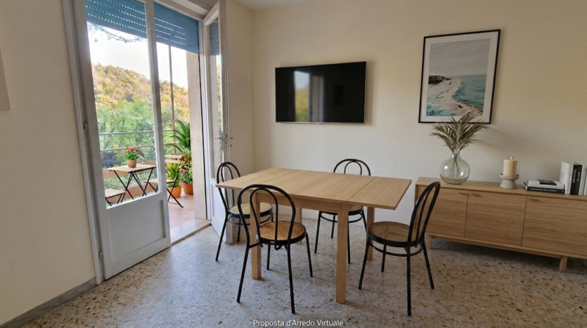 La casa si distingue per una gestione intelligente degli spazi: la cucina espone a nord rimanendo fresca, mentre la sala da pranzo e la camera matrimoniale guardano a sud, garantendo luminosità per tutto il giorno. Entrambi gli ambienti principali accedono al balcone, dove è possibile posizionare un tavolino. La seconda camera e il bagno finestrato sono esposti a ovest.