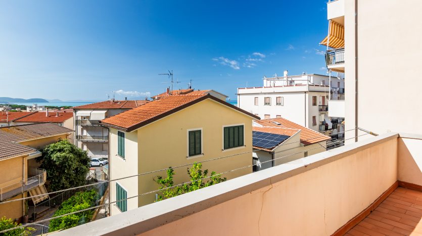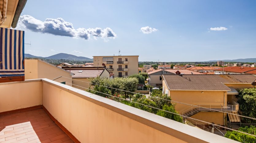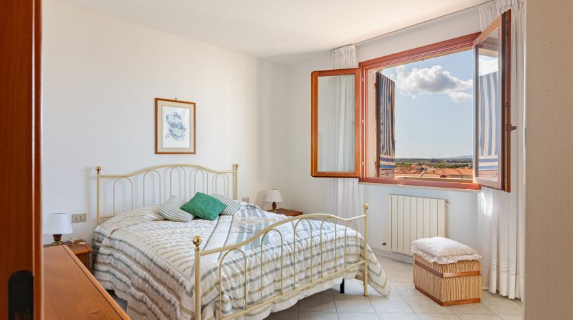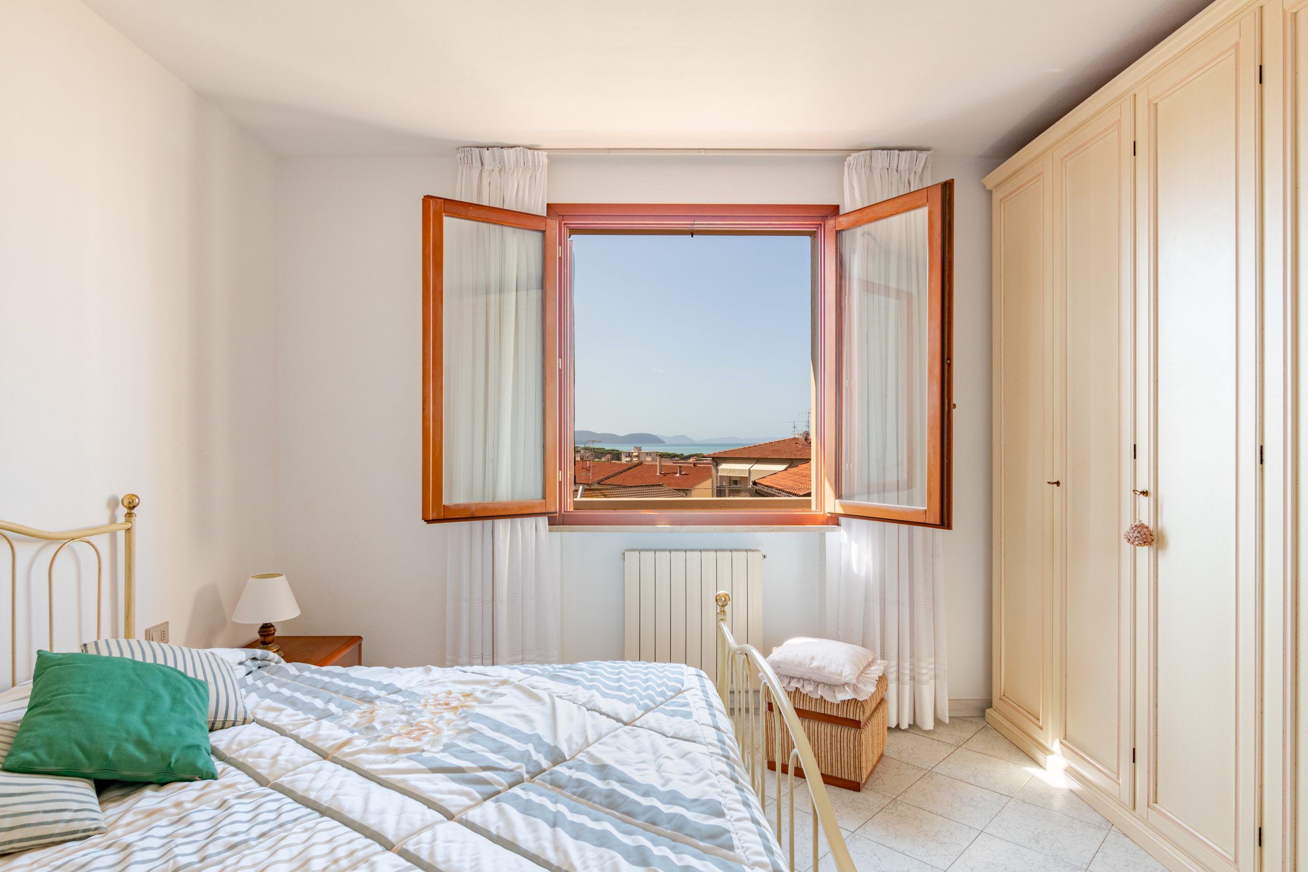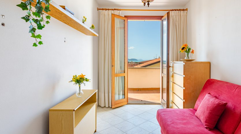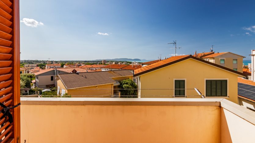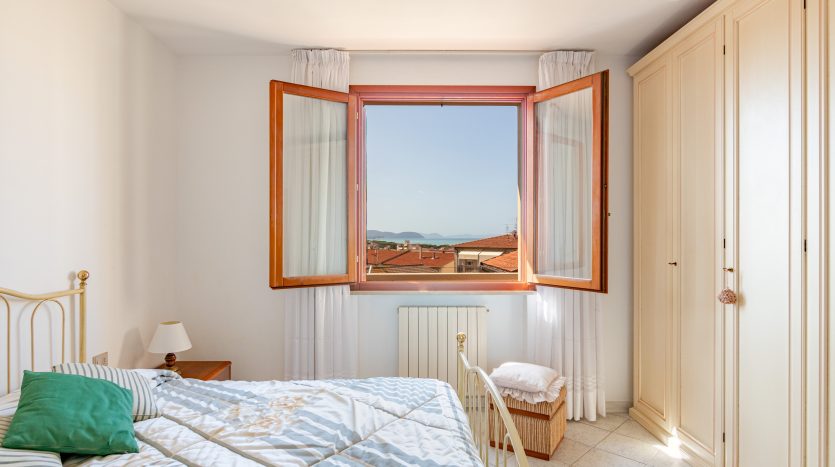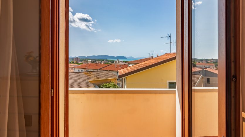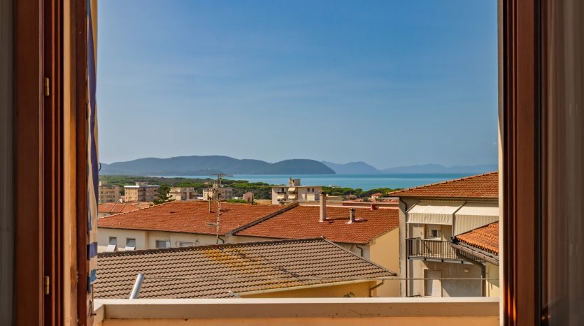 L’accesso è completamente indipendente tramite scala esterna esclusiva . Varcata la soglia, si entra in un accogliente soggiorno/zona pranzo. La cucina a vista è sapientemente disposta in un ambiente attiguo, pur rimanendo separata. La zona notte è composta da una camera matrimoniale e una cameretta singola e bagno finestrato. Entrambe le camere godono del privilegio di un piacevole scorcio vista mare. La cameretta conduce direttamente al balcone panoramico, da cui si apre la vista sul mare, sul promontorio di Populonia – Baratti, l’Isola d’Elba e le colline circostanti.